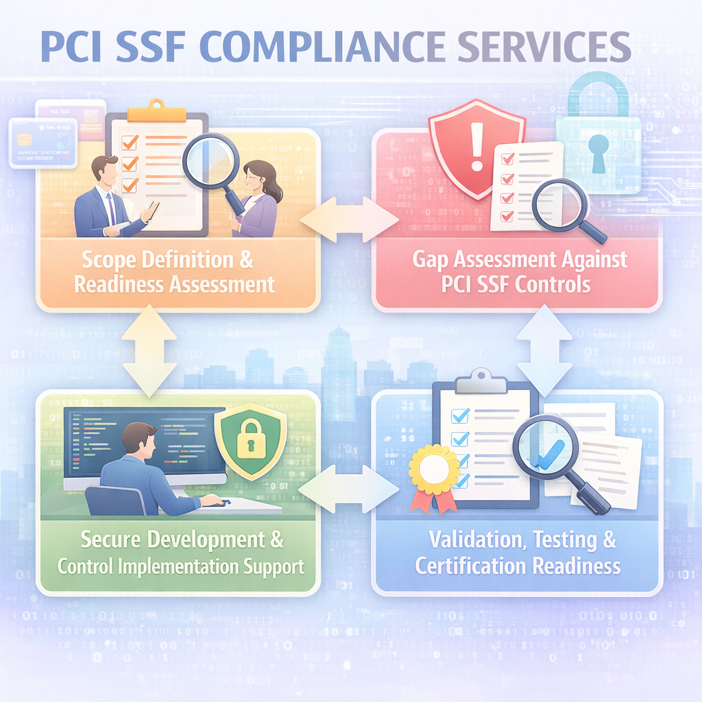 We assess your secure development practices, technical controls, and governance processes against PCI SSF requirements. This includes evaluating secure coding standards, authentication mechanisms, encryption practices, vulnerability management, and change control procedures.